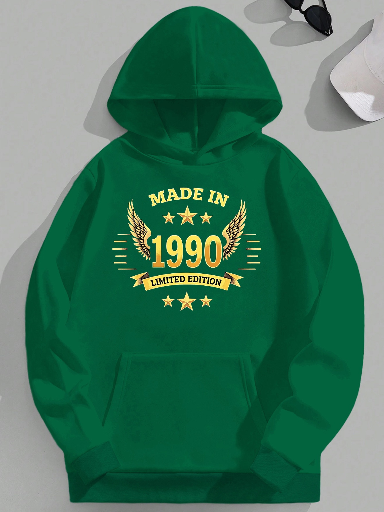 Men's Plus Size Limited Edition 1990 Hoodie - Green Graphic Print Hooded Sweatshirt with "Made in 1990" Design, Casual Loose Fit, Machine Washable, Long Sleeve, Sweater Hoodie, Plus Size