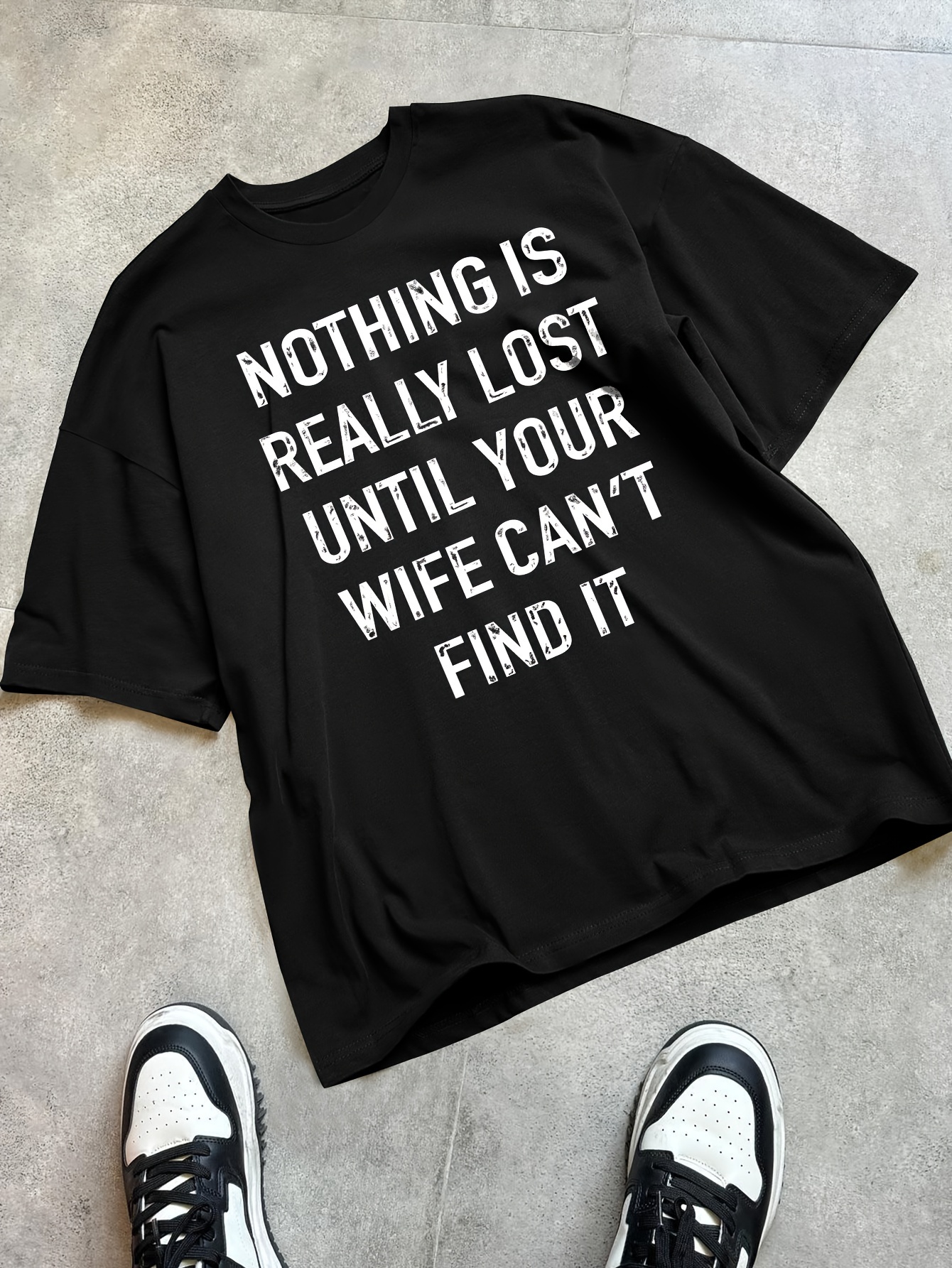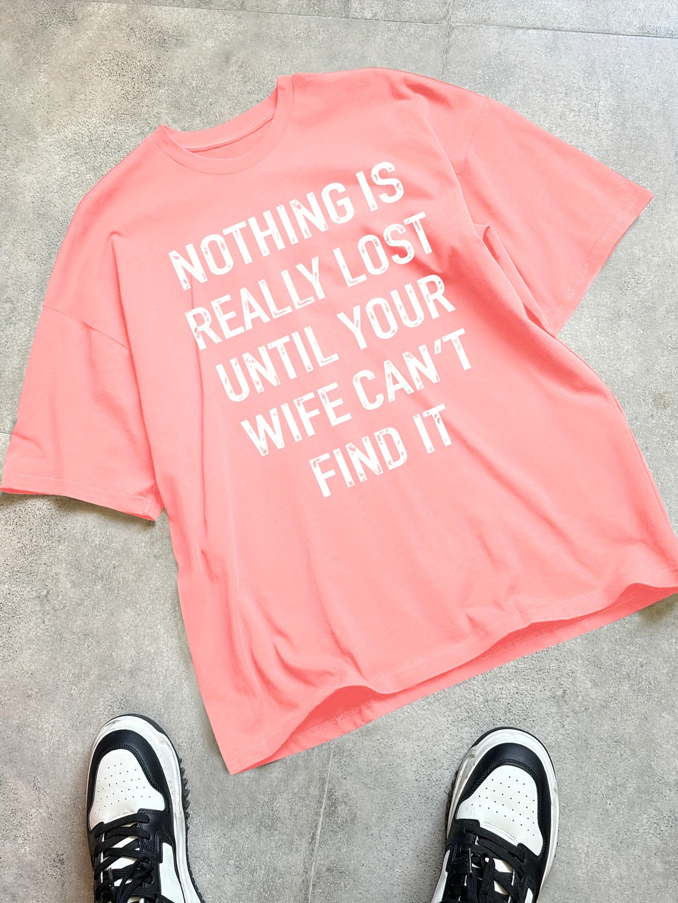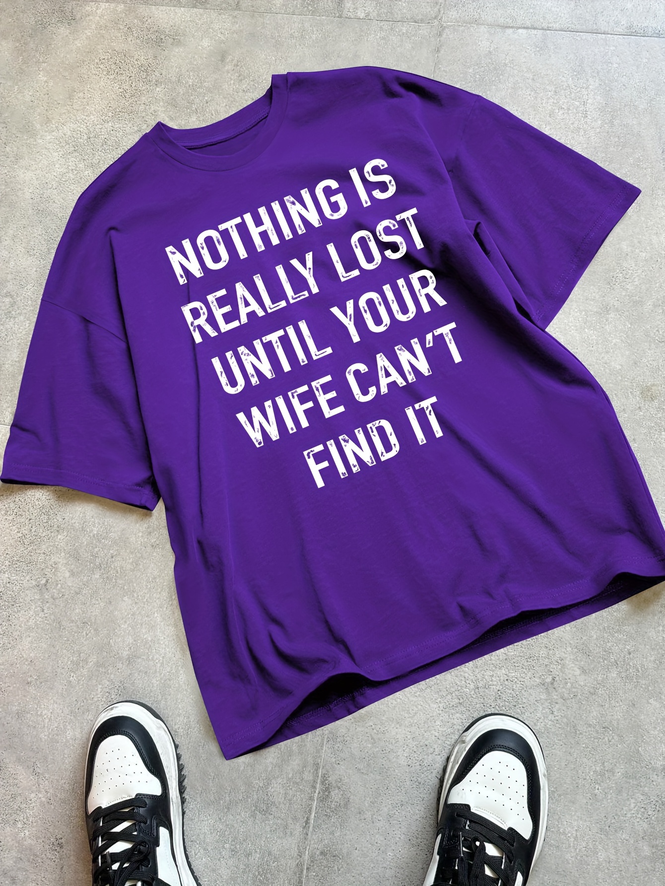 Men's Plus Size Casual Round Neck T-Shirt with "NOTHING IS REALLY LOST UNTIL YOUR WIFE CAN'T FIND IT" Slogan Print, Short Sleeve, Knit Fabric, Polyester, Adult Unisex - All Seasons
