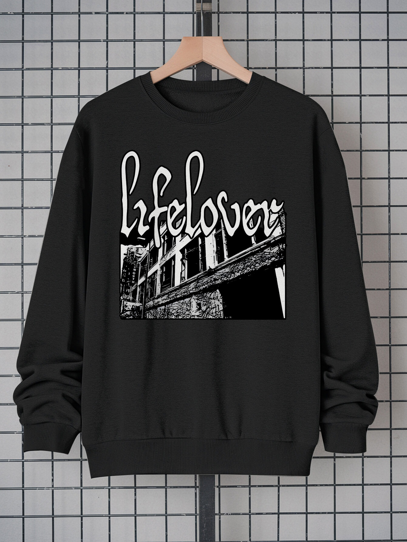 Men's 'Lifelover' Urban Graphic Sweatshirt - Black Crew Neck Pullover with Cityscape & Letter Print, Thick Casual Streetwear, Loose Fit Long Sleeve Top, Comfortable Polyester Fabric, Easy-Care Everyday Style