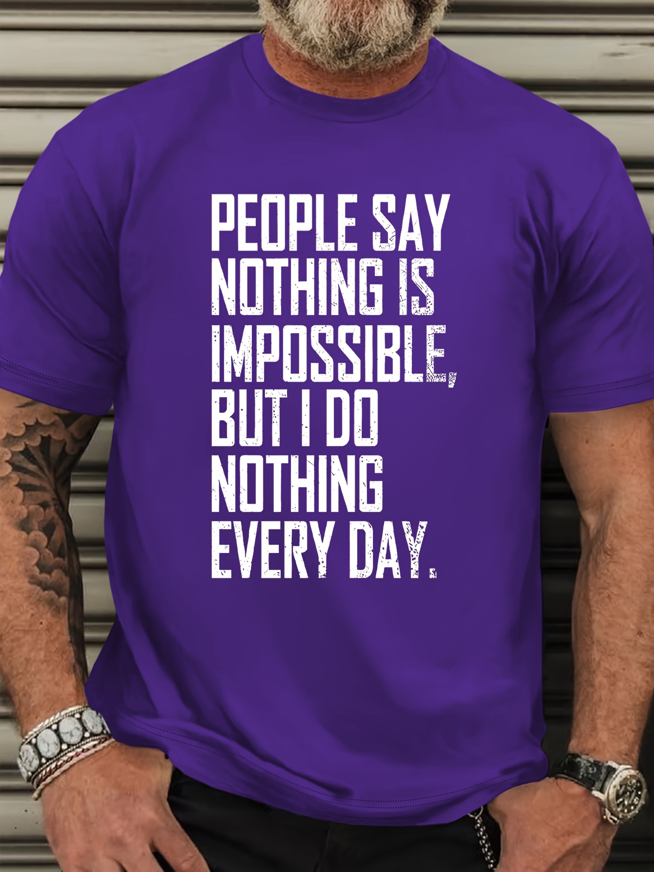 Men's Oversized Funny Slogan T-Shirt - "People Say Nothing Is Impossible But I Do Nothing" White & Purple Casual Short Sleeve Round Neck Tee, Plus Size Big & Tall Fit, Machine Washable Summer Casual Attire Humor Apparel, PLUS SIZE